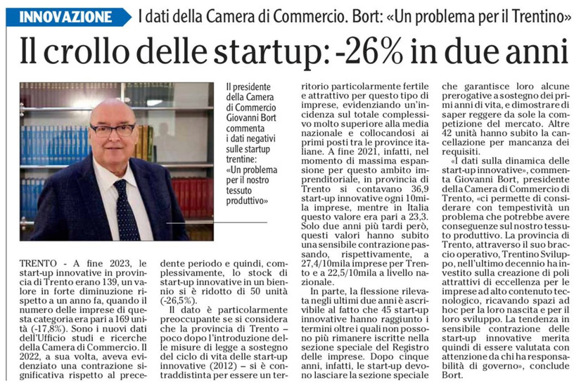 Di seguito testo dell'articolo a cura di Ottilia Morandelli de "il T Quotidiano" Nell'ultimo biennio il numero di startup innovative in Trentino è sceso di 50 unità (-26,5%). Ma se l'Ufficio studi e ricerche della Camera di Commercio di Trento, che ha organizzato i dati, parla di una tendenza che «rischia di privare il nostro tessuto produttivo di un flusso di nuove realtà innovative in grado di mantenere alta la competitività del nostro sistema economico», per l'assessore provinciale allo sviluppo economico Achille Spinelli il calo è fisiologico. «Ѐ partita la fase dell'uscita dai cinque anni, gli effetti li vedremo più avanti», dice sicuro.